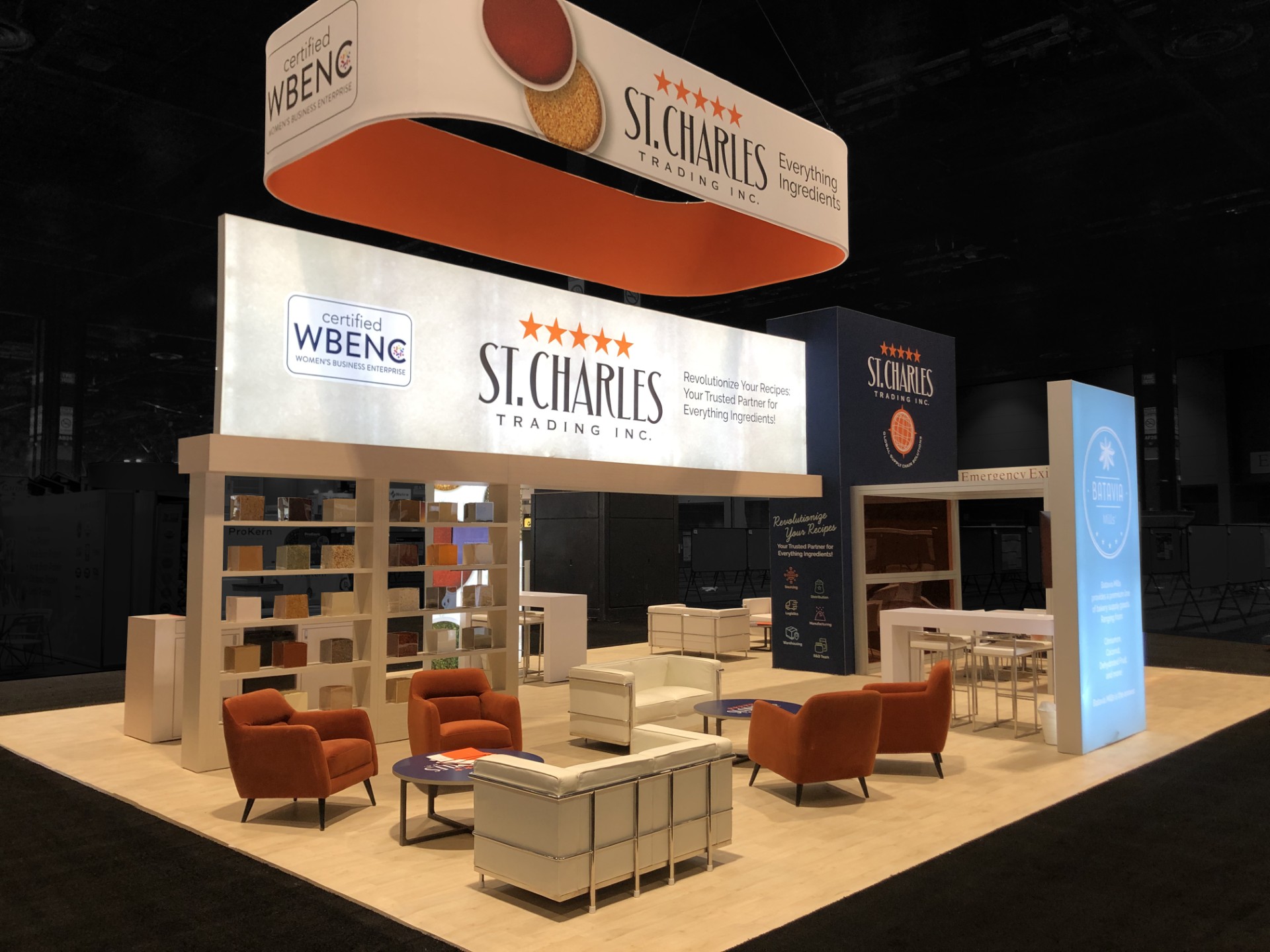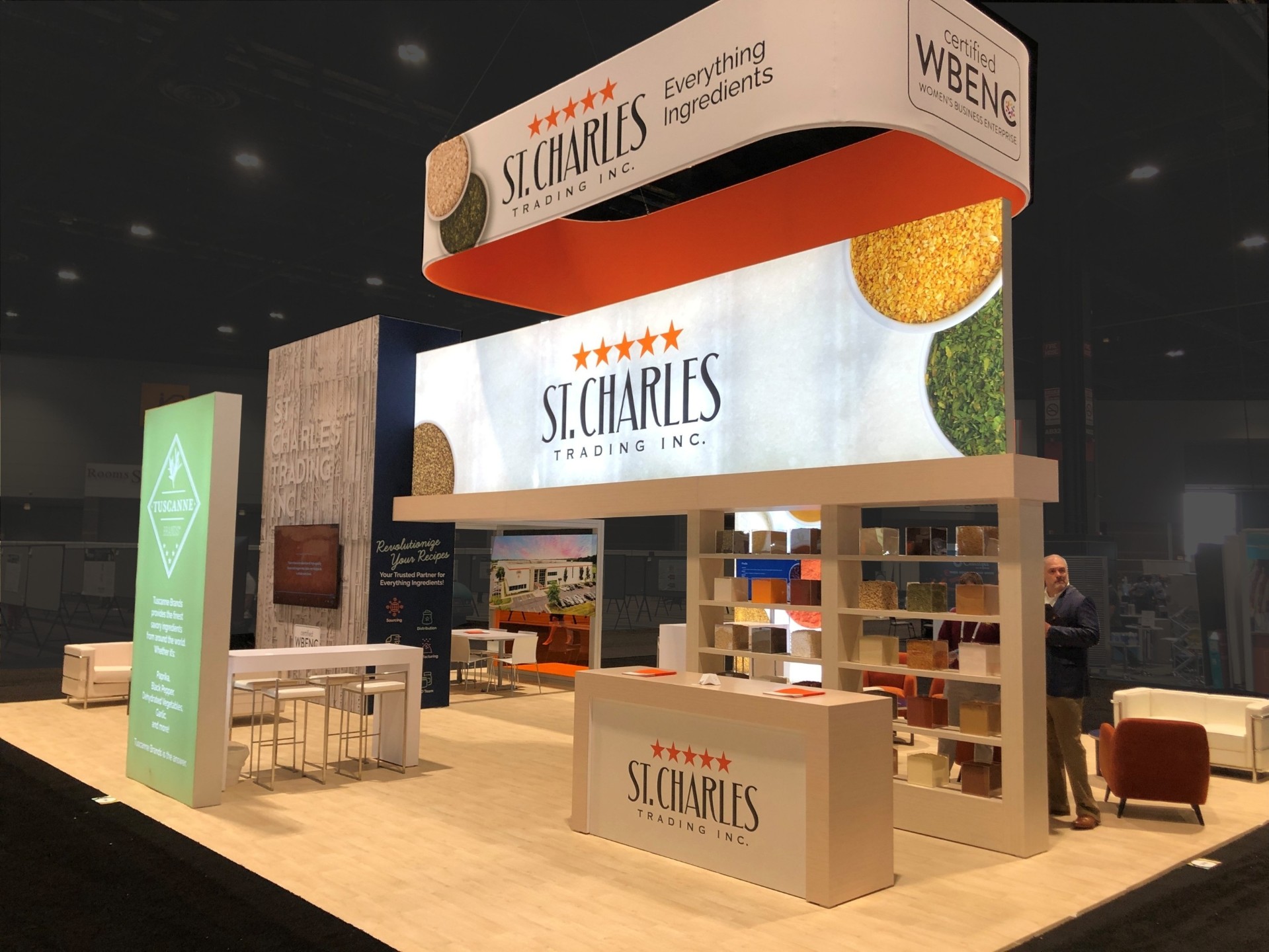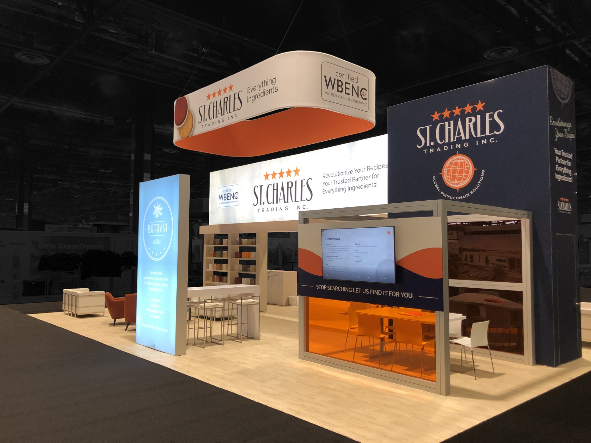 St. Charles desired a new exhibit that matched their recent rebrand and accurately reflected their industry stature. While their previous displays were portable 10x10s and 10x20s, they unveiled their new 20×20 custom modular exhibit from CenterPoint within the Organic Pavilion at IFT. The exhibit was so successful, they expanded to a similar, yet larger 30×30 exhibit the next year’s IFT, adding a larger backlit bridge for greater impact and elegant shelves for product showcasing.