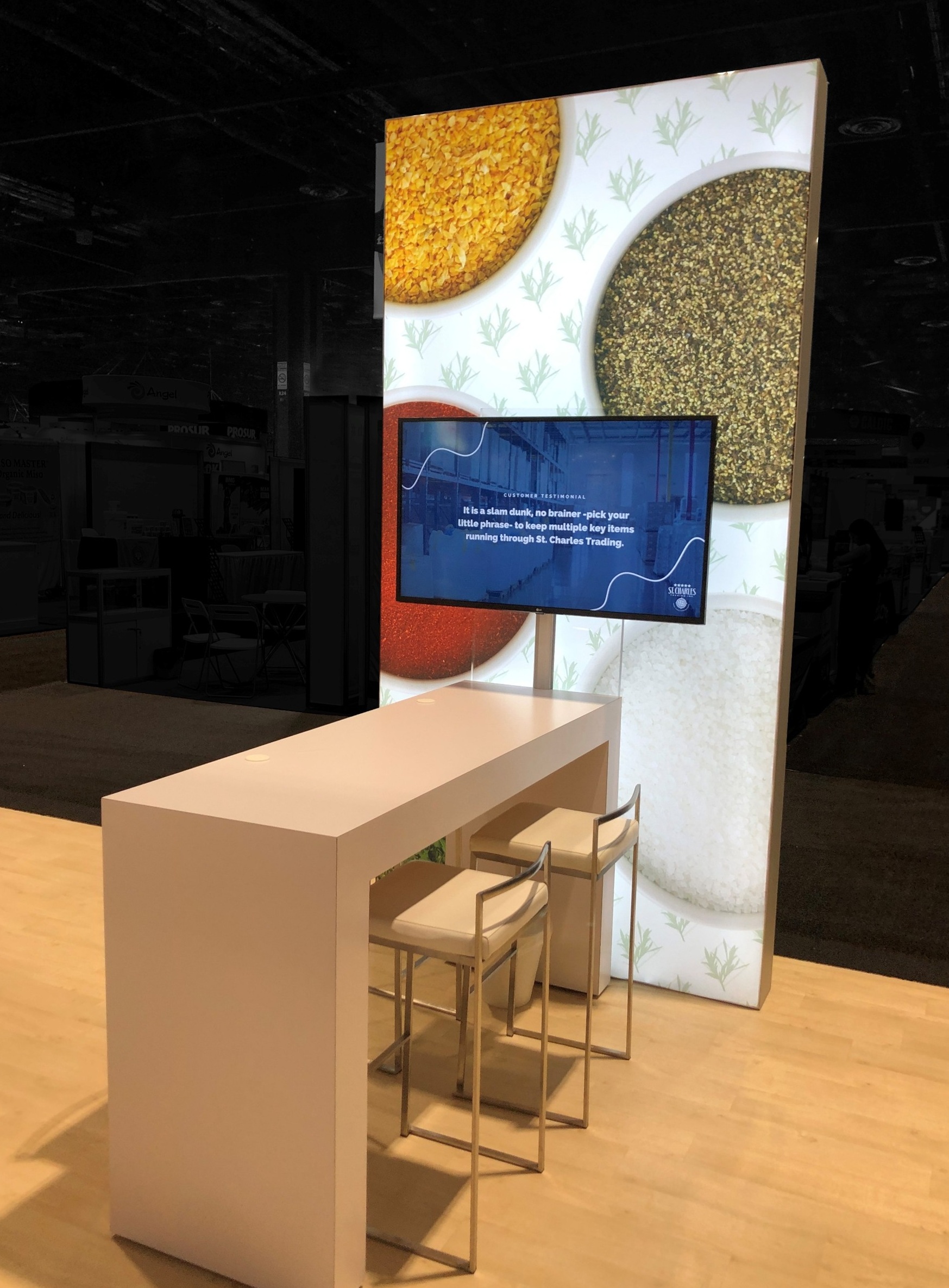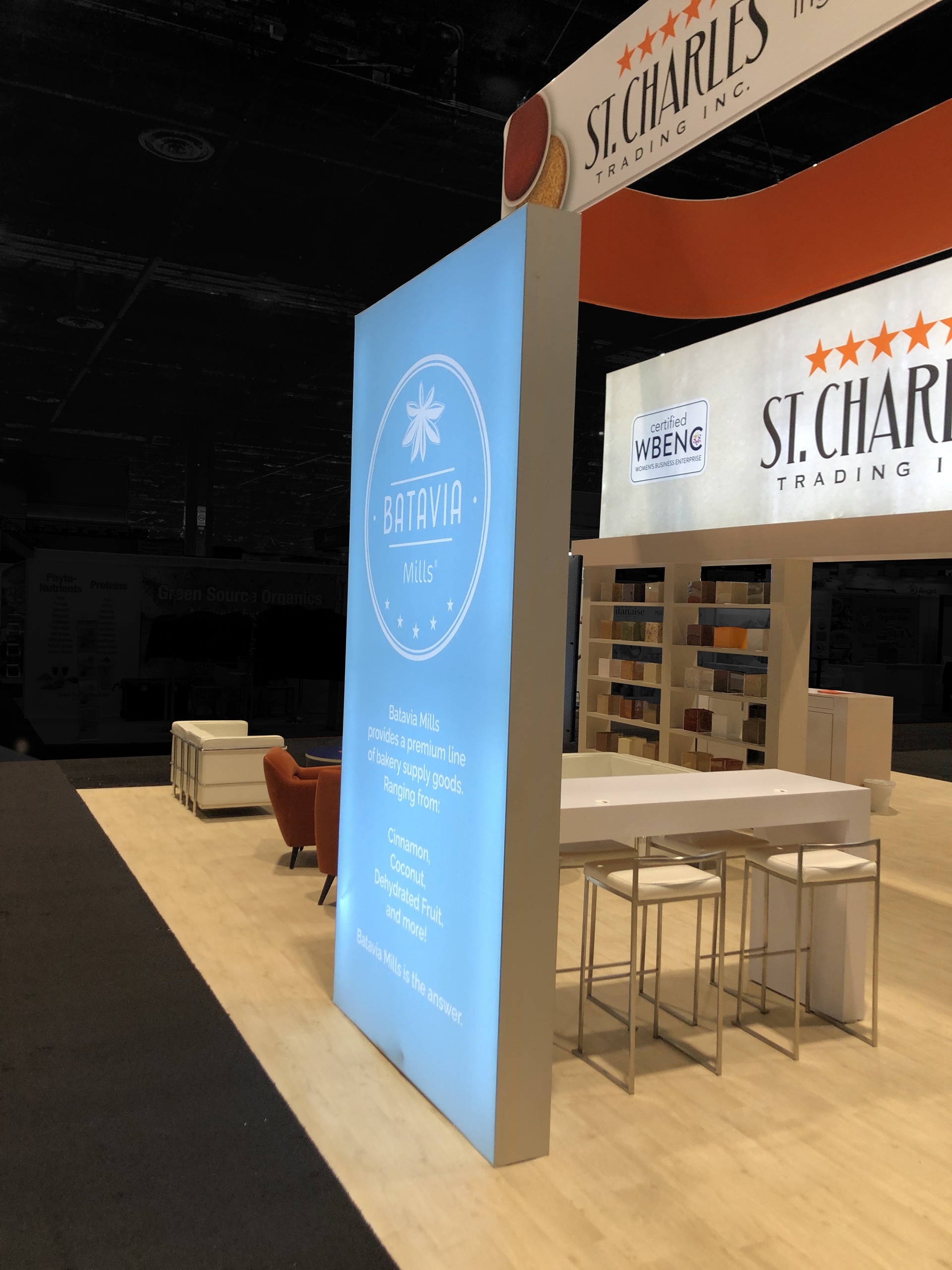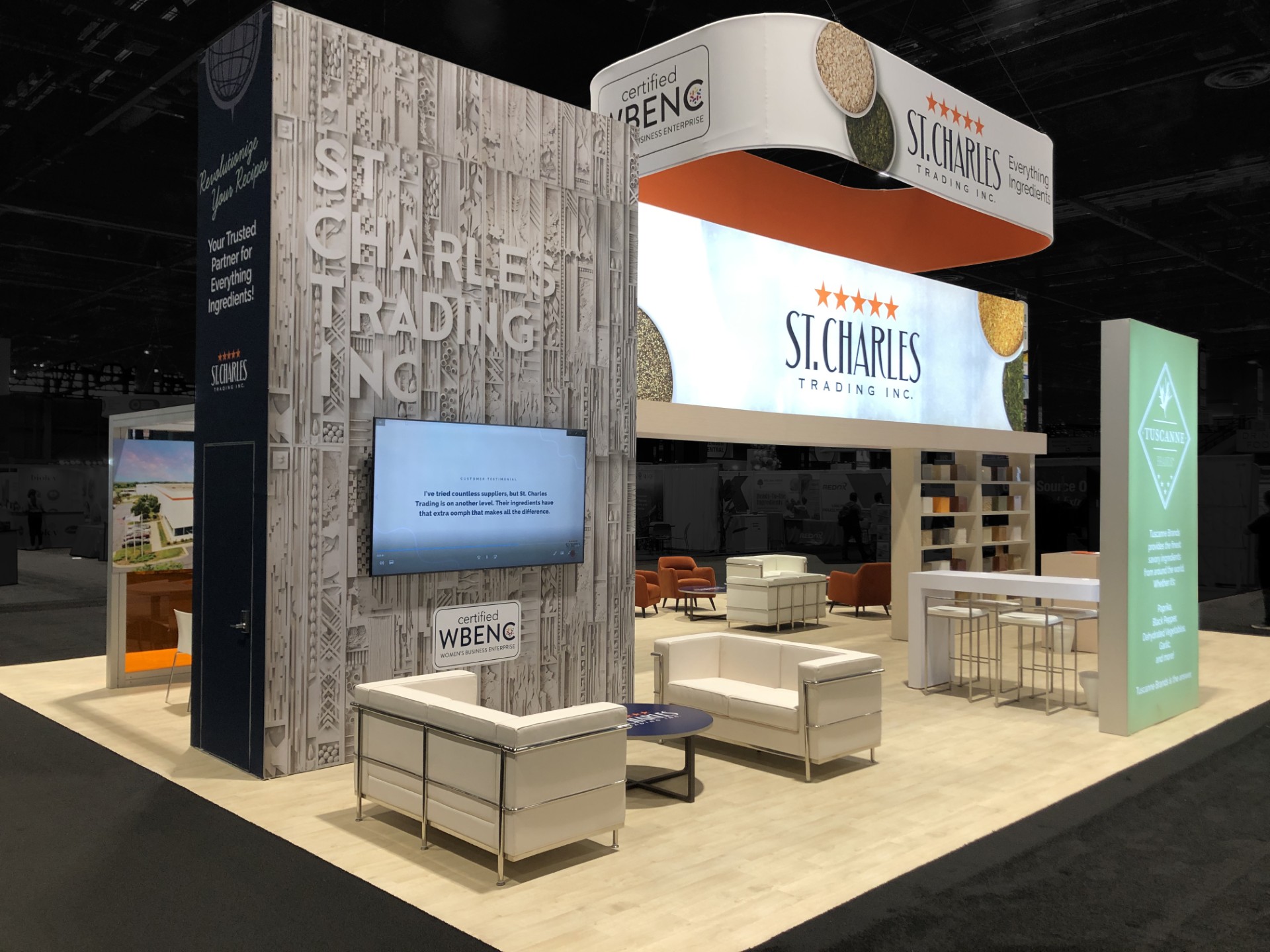St. Charles desired a new exhibit that matched their recent rebrand and accurately reflected their industry stature. While their previous displays were portable 10x10s and 10x20s, they unveiled their new 20×20 custom modular exhibit from CenterPoint within the Organic Pavilion at IFT. The exhibit was so successful, they expanded to a similar, yet larger 30×30 exhibit the next year’s IFT, adding a larger backlit bridge for greater impact and elegant shelves for product showcasing.
